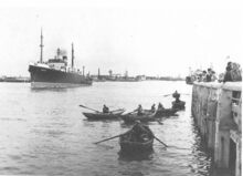 Zwart/wit foto AntonyΒ 291035-1. Formaat : 23,5 x 29,5 cm. β In het Houtdok ligt het vrachtschip Consul Poppe uit Hamburg aangemeerd dat gelost wordt. Links houthandel J. & C. Snauwaert, in de achtergrond scheepswerf Beliard-Crighton.