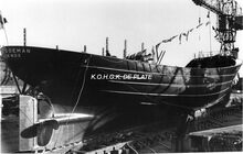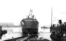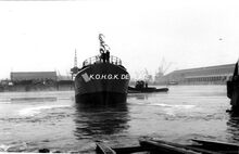 De treiler is juist van stapel gelopen in het Zwaaidok. Rechts, de houthandel Snauwaert. - Map 2009/0847-5