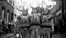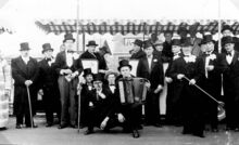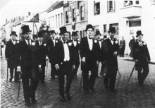Het feestcomitΓ© van de wijk Hoge Barriere, gekleed in de stijl van de Belle Epoque, lopen de Steense reuzen Pol en Rachel vooraf. Van links naar rechts : Oscar Dewachter, Louis Stubbe, Eugeen Willems, Polydore "Polo" Hoorelbeke, "Pol" Leopold Libin, Alfons Markey, Fernand Decorte, Robert Thomas, "Miel" Emiel Declercq. Uiterst rechts : Achiel Tempelaere. - Zie ook : Stene, tussen polder en stad / Daniel Deschacht. 2013, p.18. Plate Bib A636. - 090a