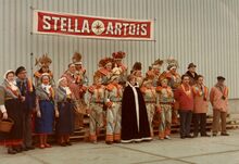 Groepsfoto met vaandel en praalwagen voor CafΓ© Mondial, uitgebaat door Harry Beuten-Aspeslagh aan de Nieuwpoortsesteenweg 283. De folkloregroep de "Oude Ijslandvaarders" werd gesticht op 06/03/1957 in de schoot van de spaardersmaatschappij "Nooit Genoeg" in voornoemd cafΓ©.