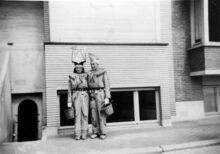 De leden van het feestcomitΓ© van de wijk Hoge Barriere voor het cafΓ© en fietsenhandel van Camiel Brackx, langs de Torhoutsesteenweg. Van links naar rechts : Louis Stubbe, Polo Hoorelbeke, Robert Thomas, Fernand Decorte, Alfons Markey, Pol Libin, Jules Carette, Miel Declercq, Eugeen Willems, Oscar Dewachter en Achille Tempelaere. Zie ook : Stene, tussen polder en stad / Daniel Deschacht. 2013, p. 19. Plate Bib A636. - 090c
