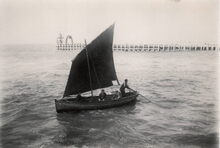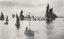 Foto : Terwijl rondom rond een menigte langs de kaaimuren staat, vaart de Croky de Oostendse jachthaven binnen. Men schat het aantal begroeters op minstens 4000