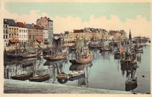 Postkaart A.V.M. - Links, de Visserskaai met de ambulante vishandel. Visservaartuigen, gemeerd in het Montgomerydok. Vooraan, de O.427 "Pascal" en de O.192 "Lydie-Madeleine"