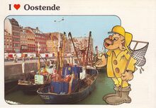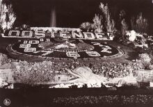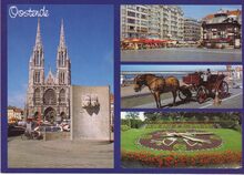 AVM. - Het Sint Petrus en Paulusplein met vooraan het oorlogsmonument voor alle Oostendenaars gesneuveld in beide wereldoorlogen. Staat nu nabij de Koninginnekapel in de Jozef II-straat. De Sint Petrus en Pauluskerk. Een koetsier met paard en koets, een vertrouwd beeld tijdens de vakantie, wacht op toeristen nabij het Zeeheldenplein. De kiosk op het Wapenplein. Het bloemenuurwerk in het Leopoldpark