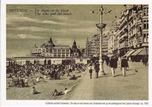 Herdruk. - Collectie archief Oostende. De dijk en het strand met op de achtergrond het Casino-Kursaal. - De Zeedijk, richting de westelijke gevel van de derde Kursaal. Rechts, de grote hotels en links, strandrecreatie op het Groot Strand en de traditionele badkarren.