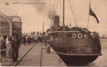 Nels. - Ostende - Embarquement pour l'Angleterre. - Links, het Zeestation. Gebouwd op de scheepswerf Cockerill" (Hoboken) en in dienst op de lijn Oostende - Dover in 1910. Het schip had een snelheid van 24 knopen. In dienst tot 1931 en hetzelfde jaar verkocht.
