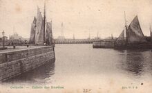 Edit. W.V.S.[183, Boulv. du Hainaut, Bruxelles]. - Ostende - Entrée des bassins. - Het Schuildok, met de toegang tot de havengeul. Zeilvissersvaartuig O.18 "Joseph-Mathilde" van reder Aug. Vandewalle met schipper L. Van de Kerckhove gemeerd aan de overkant van het dok. Links, op de Oosteroever het Quarantainegebouw en de Tweede Vuurtoren. Informatie omtrent de O.18 in : Rapport sur l'Administration et la situation des affaires de la Ville d'Ostende. 1900. p.195