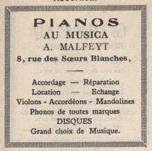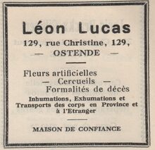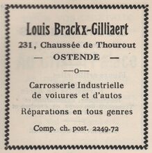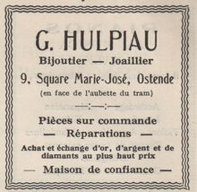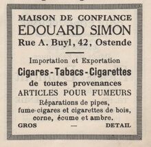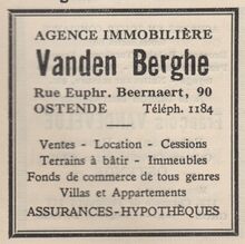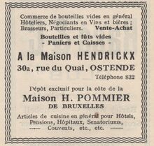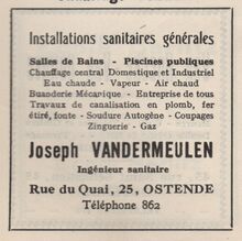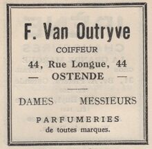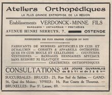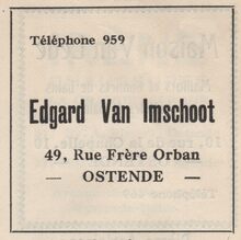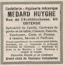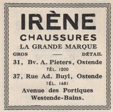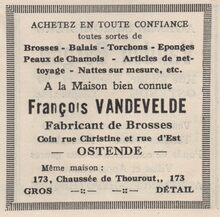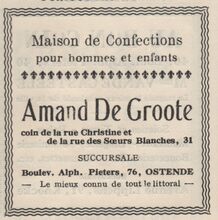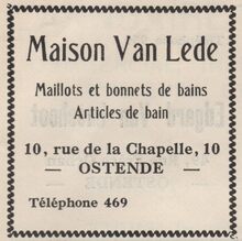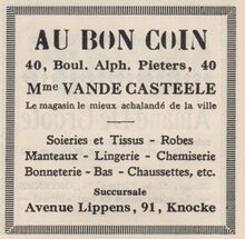 Mme Vande Casteele. Le magasin le mieux achalandé de la ville. Soieries et tissus, robes, manteaux, lingerie, chemiserie, bonneterie, bas, chaussettes, etc. Succursale: Avenue Lippens, 91, Knocke