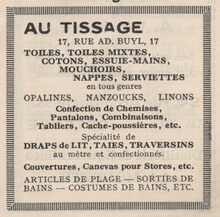 Toiles, toiles mixtes, cotons, essuie-mains, mouchoirs, nappes, serviettes en tous genres. Opalines, nanzoucks, linons. Confection de chemises, pantalons, combinaisons, tabliers, cache-poussières, etc. Spécialité de draps de lit, taies, traversins au mètre et confectionnés. Couvertures, canevas pour stores, etc. Articles de plage, sorties de bains, costumes de bains, etc.