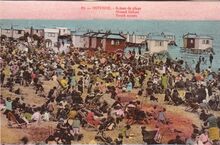 Bijgekleurde kaart. - De Zeedijk en de grote hotels ten westen van het Kursaal, met rechts het Koninklijk Chalet. Vooraan, strandrecreatie op het Groot Strand.