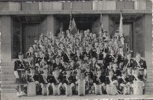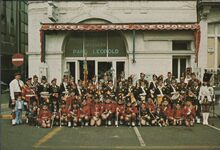 Muziekkapel van het Marinekorps Flandern in de Koningsstraat. Op de hoek Koningsstraat en Leopoldlaan, het Hotel St. Georges