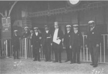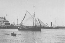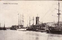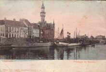 Editeur J.H. Schaefer, Amsterdam, Déposé O.10. - Ostende - Pilotage et Bassin. - Ex invent nr 1977/2222. - Bijgekleurde kaart. - Stoomtreilers van de rederij "Pêcheries à Vapeur" gemeerd in het eerste handelsdok langs de Keizerskaai. O.a. de O.82 "Albert" met schipper Em. Coopman. In : Rapport sur l'Administration et la situation des affaires de la Ville d'Ostende. 1900. Het gebouw met torentje is het Zeevaartcommissariaat, ook "Pilotage" genaamd, op de hoek met de Zuidstraat. Rechts op het einde, het eerste Zeestation