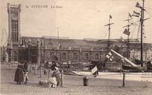 Ostende -Β La gare. - Vooraan, nabij de Kapellebrug, verkoop van droogvisΒ door een visverkoopsterΒ in traditionele kledij. Op de achtergrond, het spoorwegstation gelegen langs de Keizerskaai. Rechts, zien we nog het ingebouwde station van Payen in het station van Laureys