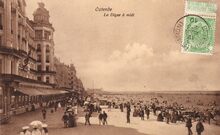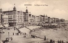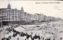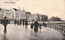 Ostende - La Digue Γ midi. - De Zeedijk ten westen van de Kursaal met op het einde het Royal Palace Hotel. Rechts, strandrecreatie op het Groot Strand. Oostende tijdens de Belle Epoque