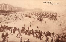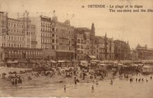 Ostende -Β La Plage Γ marΓ©e-haute. - Het Groot Strand gezien vanaf het Kursaal, richting het Koninklijk Chalet (midden) en op het einde het Royal Palace Hotel. Links, de Zeedijk met de grote hotels.