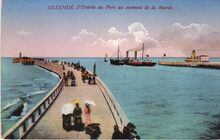 Ostende - L'EntrΓ©e du port au moment de la marΓ©e. - Gekleurde kaart - Vooraan, het Westaketsel en rechts, het Ooststaketsel. Een raderstoomboot van de Oostende - Doverlijn verlaat de haven. Een tafereel uit de Belle Epoque.