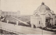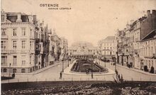 OstendeΒ -Β Avenue LΓ©opold. - De LeopoldlaanΒ gezienΒ vanuitΒ het Leopoldpark, met op het eindeΒ de zuidgevelΒ van het derdeΒ kursaal. Vooraan, rechtsΒ en links, de KarelΒ Janssenslaan