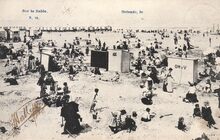 Ostende -Β La plage et les hΓ΄tels. - Bijgekleurde kaart. - Strandrecreatie op het Groot Strand. Op de achtergrond, links, langs de Zeedijk, gedeelte van de westgevel van het derde Kursaal en de grote hotels