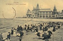 Dr. Trenkler C°. - Ostende -Le Kursaal et la plage à marée haute. - Strandrecreatie bij hoog water op het Groot Strand nabij de westelijke gevel van het derde Kursaal langs de Zeedijk