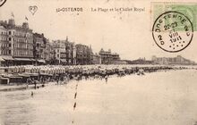 Scheers (A.S.). - La Plage et le Châlet Royal. - De Zeedijk gezien ten westen van het Kursaal richting het Koninklijk Chalet (midden) en op het einde het Royal Palace Hotel. Strandrecreatie op het Groot Strand