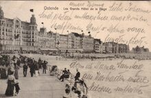 Edit. V.G. [=Victor Grégoire], 42, Avenue du Midi, Bruxelles. - Ostende - Les Grands Hôtels de la Plage. - De Zeedijk gezien vanaf het Kursaal, richting het Koninklijk Chalet. Links, het "Hôtel Continental". Strandrecreatie op het Groot Strand en de traditionele badkarren.