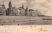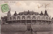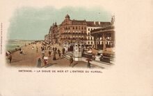 Mumm & Zaum, éditeurs, Bruxelles. - Ostende - La digue de mer et l'entrée du kursal. - Bijgekleurde kaart. - De Zeedijk, ten oosten van het derde Kursaal. Op de hoek met de Kursaal-Oosthelling, het "Hôtel Royal Belge"