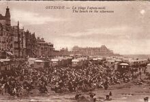 C.D.O. - Ostende - La plage l'après-midi. - The beach in the afternoon. - Het is druk op het Groot Strand. We zien de traditionele badkarren en links de grote hotels langs de Zeedijk. Wat verder het Koninklijk Chalet en op het einde het Royal Palace Hotel