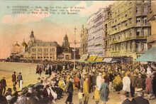 C.D.O. - Oostende - Zicht van den Dijk naar de Kursaal. Ostende - Vue de la Digue vers le Kursaal. Ostend - View of the Dike to the Kursaal. - Bijgekleurde kaart. - Veel volk op de Zeedijk, richting de westgevel van het derde Kursaal. Rechts, de grote hotels.