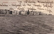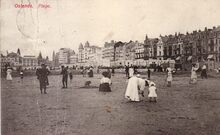 Postkaart Theys. - Ostende - La plage. - Bijgekleurde kaart. - Strandrecreatie op het Groot Strand. Op de Zeedijk, rechts, "Hotel Continental" en links, "Hotel Helvetia". In het midden, de Berlijnstraat. Omstreeks 1919 gewijzigd in Ijzertraat.
