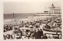 Postkaart Lits. - Strandrecreatie op het Groot Strand nabij de badinstallaties onder de Albert I-promenade. Op de achtergrond, gedeelte van de westgevel van het derde Kursaal.