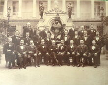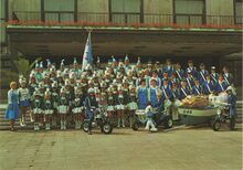 Formaat : 39 x 49 cm. - 24 leden van de toneelvereniging "Hoop in de Toekomst", poserend met vaandel op de binnenkoer het "Grand Hotel Fontaine".