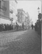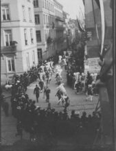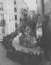 8 foto's : (1 en 2) De Vaste Ring (Antwerpen) met praalwagen en groep : Le Royaume des Gnomes. Op de Zeedijk (1) en op de hoek van de Louisastraat en de Van Iseghemlaan (2) ; (3 en 4) De Jonge Turners (Oostende) : Expansion Coloniale ; (5) Praalwagen van Le Rat Mort : Le Chart du Rat Mort ; (6) Char des Reines de la Mi-Carême de Paris ; (7) Les 5 parties du Monde en (8). Bij de laatste twee foto's zijn de groepen niet te duiden. De foto's staan in de volgorde zoals de stoet uitging, uitgezonderd de laatste twee. - Map 006 C-17a-h