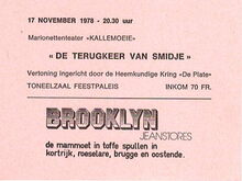 Toegangskaart tot opvoering "De Terugkeer van Smidje" door Marionettenteater Kallemoeie op 17 november 1978 in toneelzaal Feestpaleis. Vertoning ingericht door de Heemkundige Krin "De Plate"