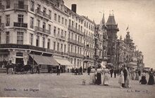Le Bon. - Ostende, les grands hôtels. - We zien de Zeedijk vanaf de kursaal richting het Koninklijk Chalet. Vooraan, het Hotel Continental. Het is vloed of "hoog water" op het Groot Strand