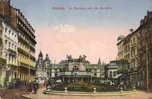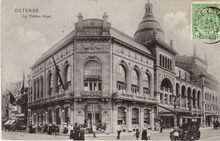 Le Bon, édit., Ostende, nr. 83. - Ostende - Nouveau Théâtre. - De Koninklijke Schouwburg op de hoek van de Vlaanderenstraat (links) en de Van Iseghemlaan (rechts). Gebouwd naar de plannen van architect Alban Chambon