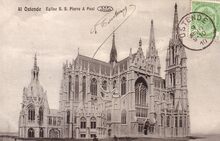 Postkaart Internationale Boekhandel. - Eglise SS Pierre et Paul. - Voor de kerk ligt een voorplein, ook "paradijs" genoemd, afgeboord door een gotische balustrade. Drie doorgangen, een centrale en twee laterale, bieden toegang tot het voorplein. Aan weerszijden van de centrale toegang staat een pijler. Hierop stonden twee beelden. Het ene stelde de heilige Livinus voor, het andere de heilige Stefanus.