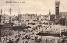 Schadeck. - Ostende - Place de la gare. - Vooraan, de handelsdokken met de Kapellebrug. Rechts, het tweede spoorwegstation van Oostende (Oostende-Stad) gelegen langs de Vandersweepplaats op de wijk Hazegras