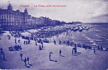 Frimat (J.F.B.). - Ostende - La Plage prise du Kursaal. - De Zeedijk gezien vanaf de westgevel van de kursaal richting het Royal Palace Hotel. Het plekje hier vooraan, noemt men "Petit Nice". Strandrecreatie op het Groot Strand tijdens vloed of "hoog water". De dames beschermen zich tegen de zon met hun parasol. Een zomers tafereel tijdens de Belle Epoque.