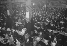 Zondag 7 december 1941. Arrondissementsvergadering in de Koninklijke Schouwburg van het Vlaamsch Nationaal Verbond (VNV) met een toespraak van Staf De Clercq. Ook aanwezig leden van de Zwarte Brigade, met op de eerste rij Joris Vansteenland, hoofd van de Dietsche Militie. Dietsche Militie - Zwarte Brigade was een Vlaamse organisatie van nazigezinde militanten binnen het VNV.