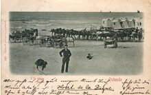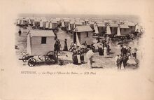 [Neurdein], ND Phot, nr.29. - Ostende - La Plage à l'Heure des Bains. - Een gedeelte van het Groot Strand, met aan de vloedlijn de traditionele badkarren. Vrouwen met hun parasols en mannen keuvelen. Misschien gaan zij nog in zee baden. Oostende in de Belle Epoque.