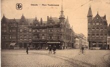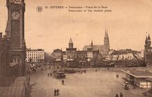 Walschaerts, nr.21. - Ostende -Panorama place de la gare. De Vandersweepplaats op de wijk Hazegras. Links, het tweede spoorwegstation van Oostende (Oostende-Stad). Rechts, een wachthuisje voor de tram. Op de achtergrond, de Keizerskaai, vanaf mei 1919, de Vindictivelaan. Rechtdoor, de Kapellestraat
