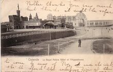 Wilhelm Hoffmann A.G., Dresde, N° 3118. Ostende - Le Royal Palace Hôtel et l'Hippodrome. - Links, de Wellingtonrenbaan met het Fort Wellington als imposante toegang en de ingang van het "Royal Palace Hotel", gezien vanuit de Koersenlaan
