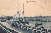 Walschaerts, N° 129. - Ostende - Entrée du Port. - Entrance of the harbour. - Vooraan, zeilschepen gemeerd aan één van de staketsels. Wat verder, links, de kaai nabij het Zeestation, aanlegplaats voor de pakketboten van de Oostende - Dover lijn. Rechts, de oosteroever, met de werkhuizen van het Bestuur van het Zeewezen.