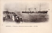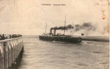 [Neurdein], ND Phot., N° 71. - Ostende - L'Estacade au Moment de la Sortie de la Malle. - We zien vanaf het Weststaketsel een pakketboot van de Oostende Dover lijn de haven verlaten. "'t Koptje van 't hoofd", of het einde van het staketsel met een paviljoentje, waar je een drankje kon nuttigen en genieten van de gezonde zeelucht. Met een kruisnet kon je proberen een krabbetje of visje te verschalken. Oostende in de Belle Epoque.