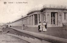 Star, Héliotypie De Graeve, Gand, N° 2374. - Ostende - La Galerie Royale. - De Koninklijke Gaanderijen gelegen langs de Zeedijk. Twee vrouwen poseren voor de fotograaf. Oostende in de Belle Epoque. Gebouwd in de periode 1902 en voltooid in 1906 naar de plannen van de Franse architect Charles Girault en uitgevoerd door de aannemer Smis-Valcke. Een 366 m. lange, rechtlijnige overdekte wandelgalerij tussen het toenmalig Koninklijk Chalet en de toegang tot de Wellingtonrenbaan. Beschermd als monument bij KB van 22/09/1981