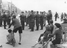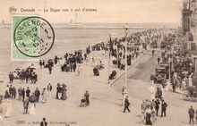 [Neurdein], ND Phot., N° 14. - Ostende - La Digue de mer. - De Zeedijk, met rechts, de Venetiaanse Gaanderijen. De hoek met de Parijsstraat tot aan de westgevel van het derde Kursaal. Links, het Groot Strand met de strandcabines en wat verder de badkarren. Een vrouw met kinderwagen, nabij de trappen, geniet van een zonnige dag