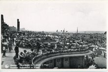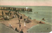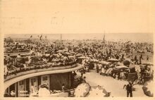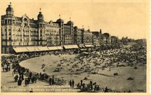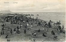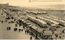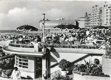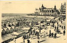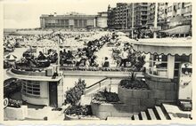 Strandrecreatie op het groot strand nabij de badinstallaties onder de Albert I-promenade. Op het einde, detail van de westgevel van het vierde Kursaal