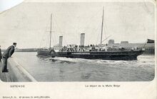 Aqua photo 2011. - Ostende - La malle allant à Douvres. - Bijgekleurde kaart. - Een pakketboot van de Oostende Dover lijn in de havengeul. Rechts, zien we de Oosteroever en het Ooststaketsel, met rechts, de tweede vuurtoren en in het midden, het Quarantaine gebouw
