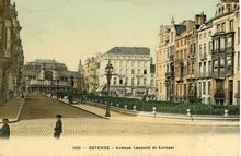 De Leopoldlaan met zijn sierlijke straatverlichting en verzorgde bloemenperken, gezien vanaf de Karel Janssenslaan richting de zuidgevel van het derde kursaal. Rechts het Marie-Joséplein.