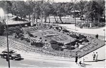De muziekkiosk in het Leopoldpark. In de achtergrond, het postgebouw in de Hendrik Serruyslaan